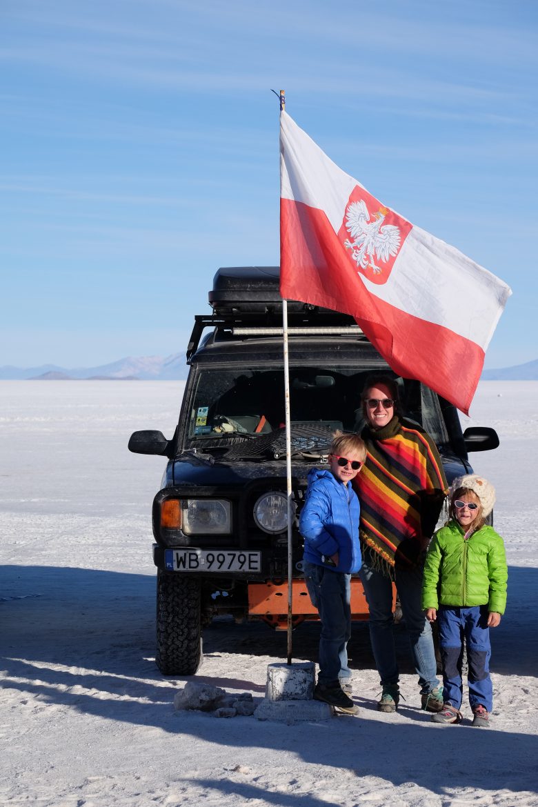 Brniemy w tej pÅ‚ytkiej wodzie przez dobre 30min, aby dotrzeć na miejsce gdzie zaczekamy na wschód. Na naszych oczach rozgrywa siÄ™ niepowtarzalny spektakl. Nigdy w życiu nie widzieliÅ›my czegoÅ› równie piÄ™knego. PÅ‚ytka warstwa wody wytworzyÅ‚a idealne lustro pod naszymi nogami a lekkie chmury na wschodzie dodaÅ‚y ciekawego akcentu do krajobrazu. Åazimy w mokrych butach w zimnej wodzie i robimy zdjÄ™cia. Dzieci siedzÄ… na masce i podziwiajÄ… z nami to widowisko. Gdy sÅ‚oÅ„ce wychodzi zza horyzontu robimy Å›niadanie. Owsianka i kawa grzejÄ… siÄ™ na kuchence, a nam robi siÄ™ coraz zimniej. Åšniadanie zjadamy w aucie, ruszajÄ…c w kierunku wyspy Incahuasi po solnej równinie. Po przejechaniu jakichÅ› 500m woda znika, a powierzchnia solniska pokrywa siÄ™ Å›ladami aut pÄ™dzÄ…cych w kierunku wyspy. Kilka równolegÅ‚ych Å›ladów prowadzi w to samo miejsce – na wyspie wszystkie grupy zorganizowane, które oglÄ…dajÄ… wschód sÅ‚oÅ„ca majÄ… swoje Å›niadanie. Nie mamy już gotówki, żeby zapÅ‚acić za wejÅ›cie na górÄ™ wyspy. Jest nam zimno dlatego od razu po zrobieniu kilku zdjęć pod polskÄ… flagÄ…(!) ruszamy w stronÄ™ Uyuni. Mamy przed sobÄ… 100km równej jak stół autostrady o nieskoÅ„czonej iloÅ›ci pasów i zerowym ruchu. Ach, jak fajnie by byÅ‚o mieć taki salar miÄ™dzy WarszawÄ… a ÅodziÄ… zamiast A2…